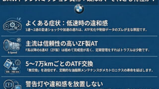 BMWに関する話題で、必ずと言っていいほど出てくるのが「トランスミッション異常」という言葉です。警告灯が出た、低速でギクシャクする、発進がもたつく…。こうした声を見聞きすると、「BMWはやっぱり壊れやすいのでは?」と不安になる人も多いはずで...