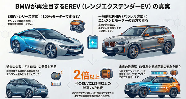 BMWが検討するEREV(レンジエクステンダーEV)の現在地を整理。i3 REX撤退の背景、PHEVとの違いシリーズ方式とパラレル方式の技術的差異、欧州規制と市場ニーズから見た今後の発売可能性を詳しく解説する。