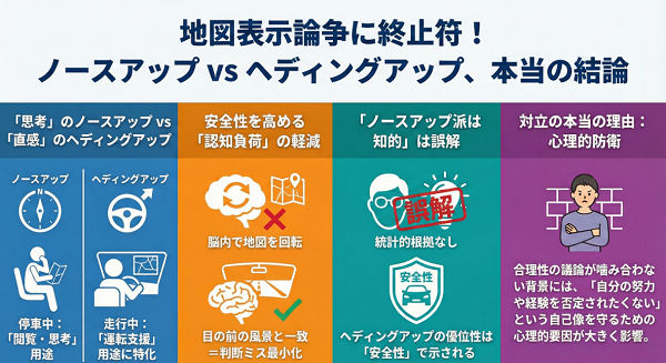 ノースアップ派とヘディングアップ派の対立が消えない最大の理由は、技術ではなく心理です。