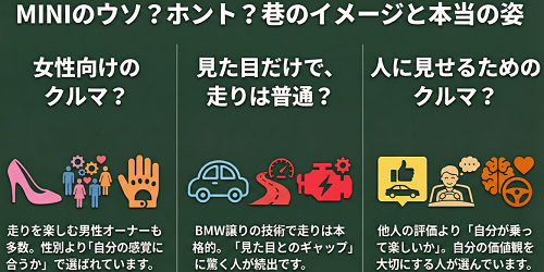 しかし、実際のMINIオーナーの声や購入背景を見ていくと、こうした印象とは異なる現実が浮かび上がってきます。ここでは、よく語られるイメージと、実際とのズレを整理してみます。