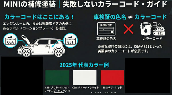 BMW MINIのボディカラーコードは、塗装色を特定するための英数字の識別番号です。