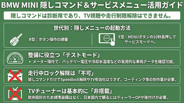 BMW MINIの隠しコマンド(サービスメニュー)、R型・F型のメンテナンスモード、TVチューナー搭載の有無、そしてSpeedlock(走行中映像制限)の解除可否について、実用目線でわかりやすく整理します。