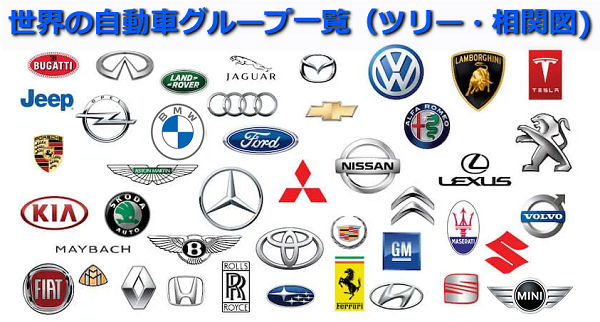 「頂点に君臨する自動車の主要メーカー(グループ)を起点」に、各グループ配下のブランド/子会社をツリー構造で可視化した一覧です。