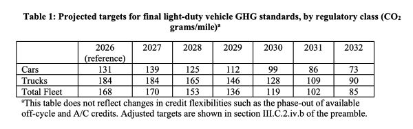 LDVの二酸化炭素(CO2)の排出基準は、最終年に当たる2032年モデルで、業界平均1マイル(約1.6キロ)当たり82グラム(82gpm)と設定された。2022年2月に発効した現行規制の最終年に当たる2026年モデル(186gpm)と比べ、56%の削減が求められる。