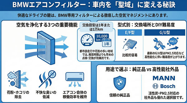 BMWの車内を快適に保つためには、エアコンフィルターは欠かせません。E/F/G/U型に応じて、交換方法やフィルター種類は異なりますが、共通して言えるのは「定期的なチェックと交換」が快適な空気環境を維持する鍵になることです。PM2.5対応や活性炭入りフィルターを選ぶことで、花粉や臭いの対策も同時に行えます。