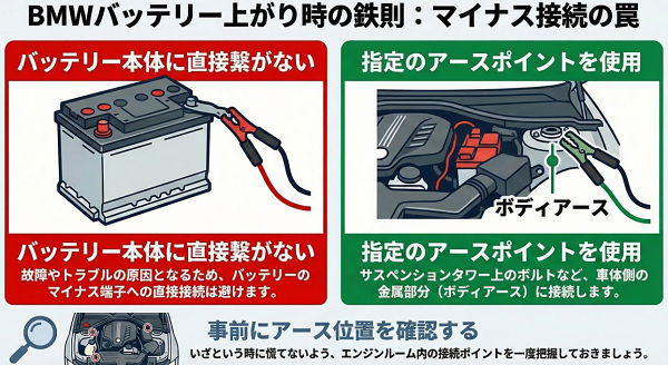 朝エンジンをかけようとしたら無反応…。BMWオーナーであれば一度は経験する「バッテリー上がり」ですが、ここで意外と迷うのが「どこにマイナスをつなぐのか?」という点です。