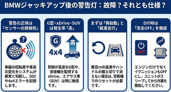 BMWをジャッキアップした後、エンジンをかけたら警告灯が点灯して驚いた経験はありませんか。特に近年のBMWは電子制御が高度化しており、リフトアップによる車輪の回転差や車高変化を“異常”として記録することがあります。