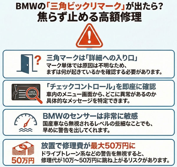 BMWに乗っていて、ある日ふとメーターを見ると「三角のビックリマーク」が点灯。これ、初見だとかなり焦りますよね。実際に乗っていると分かるのですが、この三角マークは「故障そのもの」ではなく、“何か起きているから詳細を見てください”という入口のサインです。