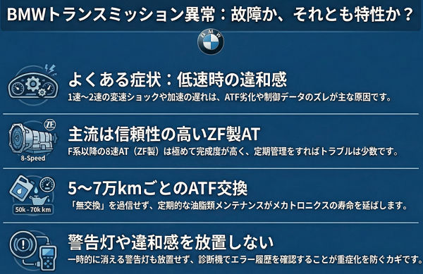 BMWに関する話題で、必ずと言っていいほど出てくるのが「トランスミッション異常」という言葉です。警告灯が出た、低速でギクシャクする、発進がもたつく…。