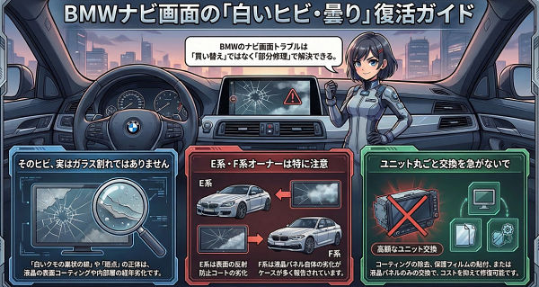 BMWのナビ画面に現れる白いヒビの多くは、実際の画面割れではなく表面コーティングの劣化が原因です。